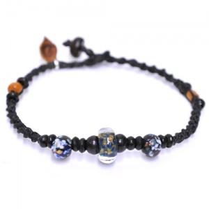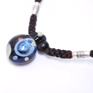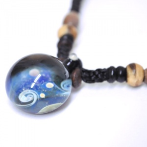 宇宙をモチーフにしたペンダントと小さいながら奥深い色合いのガラスや木のビーズを、丈夫で高級感あるロウ引きヒモを使って編み込んだ