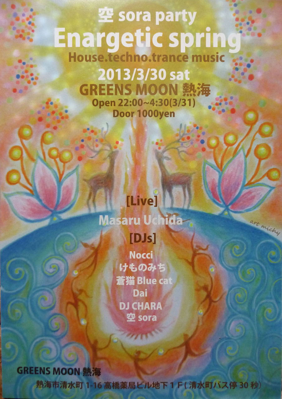1997-1998 ドイツ・ベルリンに留学.1999年より伊豆にてTechno/House系イベントを主催、彼のライブプレイと共に好評を得る。
