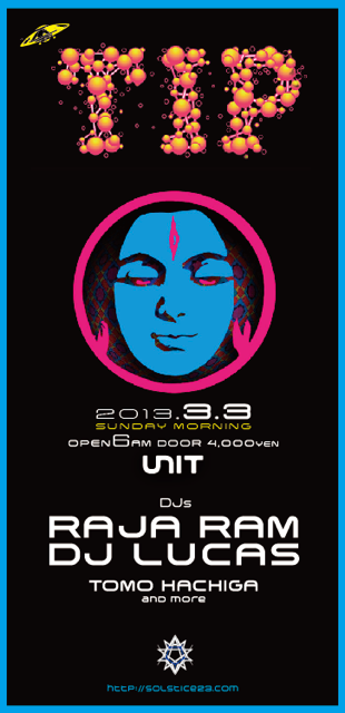 “TIP PARTY” DATE: 2013.3.3 (Sun) 6AM PLACE: UNIT DAIKANYAMA DOOR: 4,000YEN DJs: RAJA RAM / DJ LUCAS / TOMO HACHIGA and more [UNIT] 06:00 – 08:00 TOMO HACHIGA 08:00 – 10:00 RAJA RAM 10:00 – 12:00 DJ LUCAS